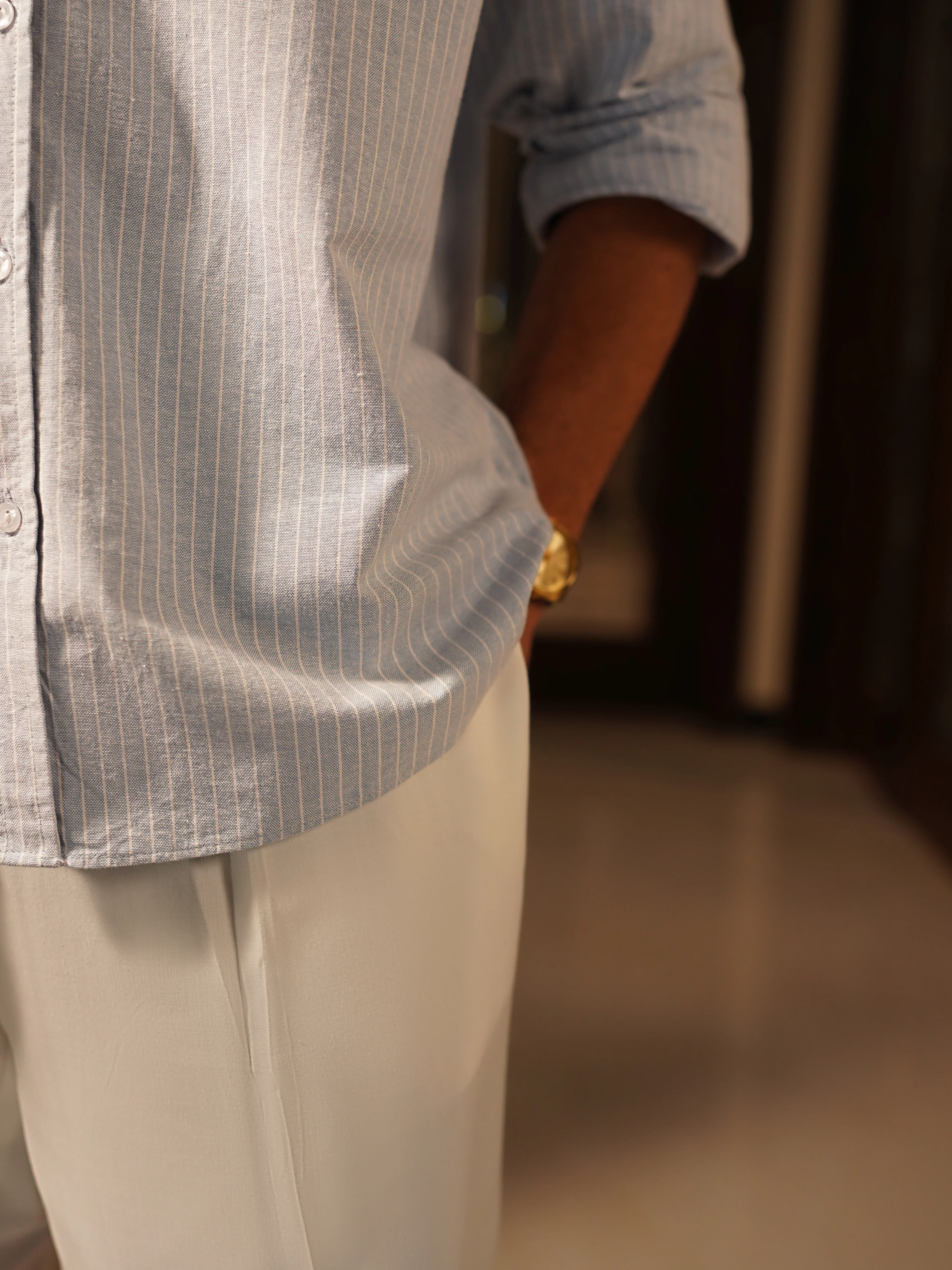 A modern interpretation of classic sophistication. This shirt is crafted from a premium, heavyweight textured 100% cotton oxford fabric that offers both durability and breathable feel. The rich, light blue hue is complemented by discreet white lining throughout the collar, cuffs, and placket, adding a touch of contrast while maintaining understated elegance. The shirt features a baggy fit with a classic coat collar, mother-of-pearl buttons, and precise hand-stitched detailing, ensuring a sharp, polished look. The white accents subtly elevate the design without overpowering its quiet sophistication, making it ideal for both formal occasions and smart-casual settings. Designed for those who appreciate the finer things in life, it is a versatile piece that adds a layer of luxury to any wardrobe.