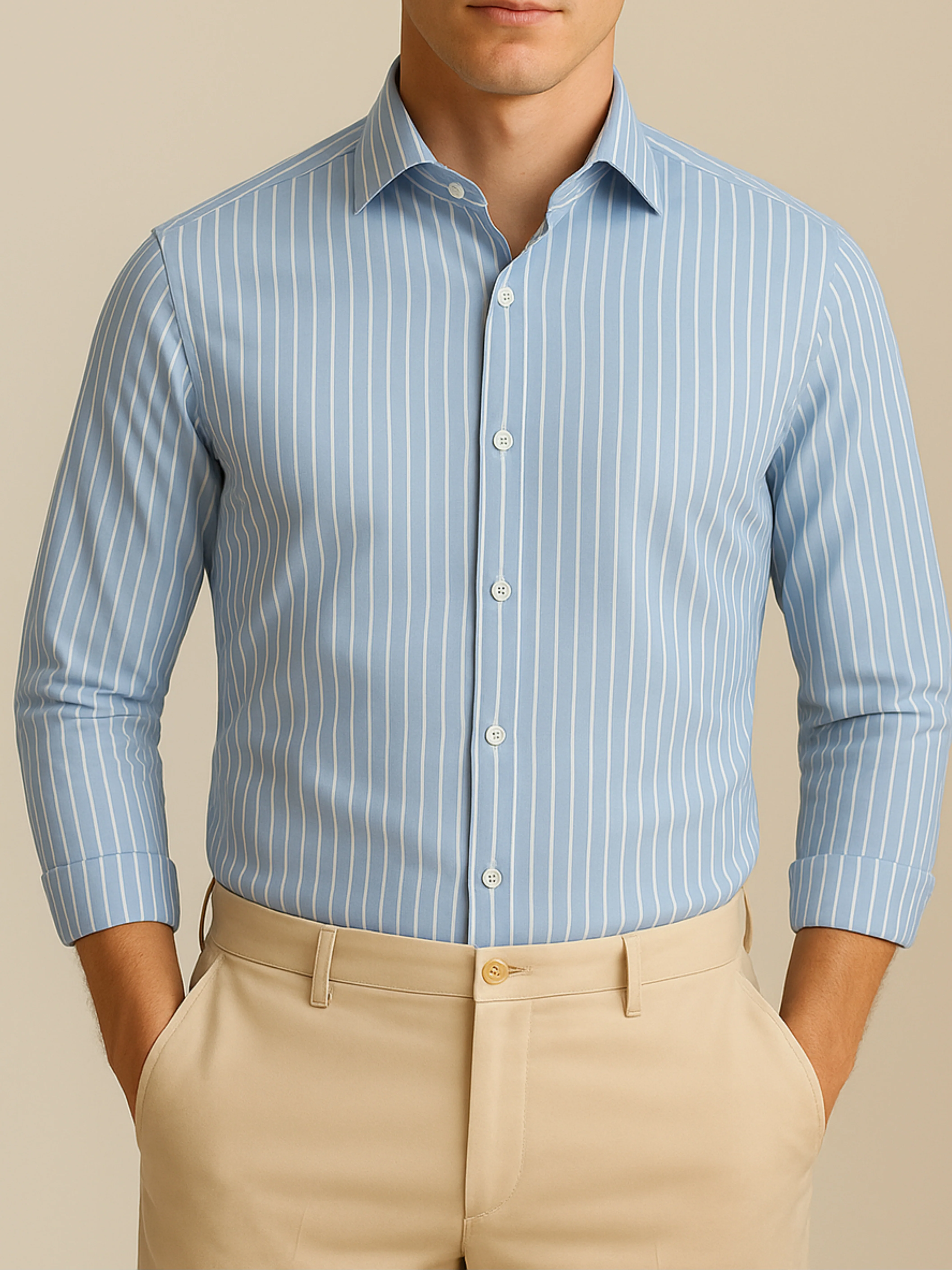 A modern interpretation of classic sophistication. This refined shirt is hand-crafted from a premium, textured cotton oxford fabric that offers both durability and a soft, breathable feel. The rich, light blue hue is complemented by discreet white lining throughout the collar, cuffs, and placket, adding a touch of distinction while maintaining elegance and sustainability. The shirt features a baggy fit with a classic coat collar, mother-of-pearl buttons, and precise hand-stitched detailing, ensuring a sharp, polished look. The white accents subtly elevate the design without overpowering its quiet sophistication, making it ideal for both formal occasions and smart-casual settings.
