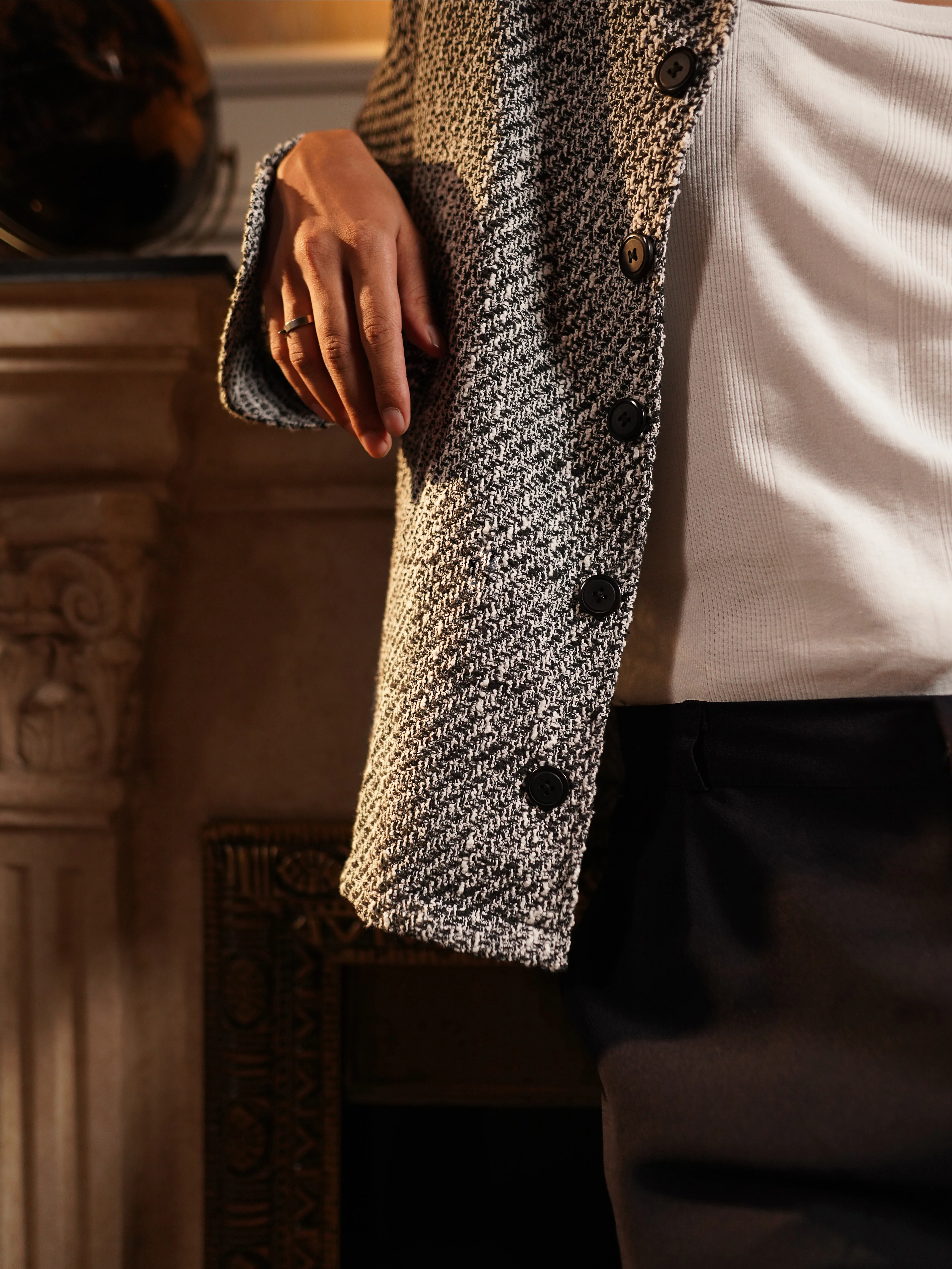 The shirt features a classic coat collar and a tailored fit that provides a sharp, streamlined look. The sustainable fabric’s rich texture and soft hand feel elevate it beyond your typical winter shirt, giving it a sophisticated, polished appearance. The warm, yet lightweight material ensures a perfect balance of warmth and mobility, allowing for ease of movement without bulk. Subtle details, such as fine stitching and midnight buttons, enhance the shirt’s understated luxury, making it suitable for both casual outings and more formal occasions.