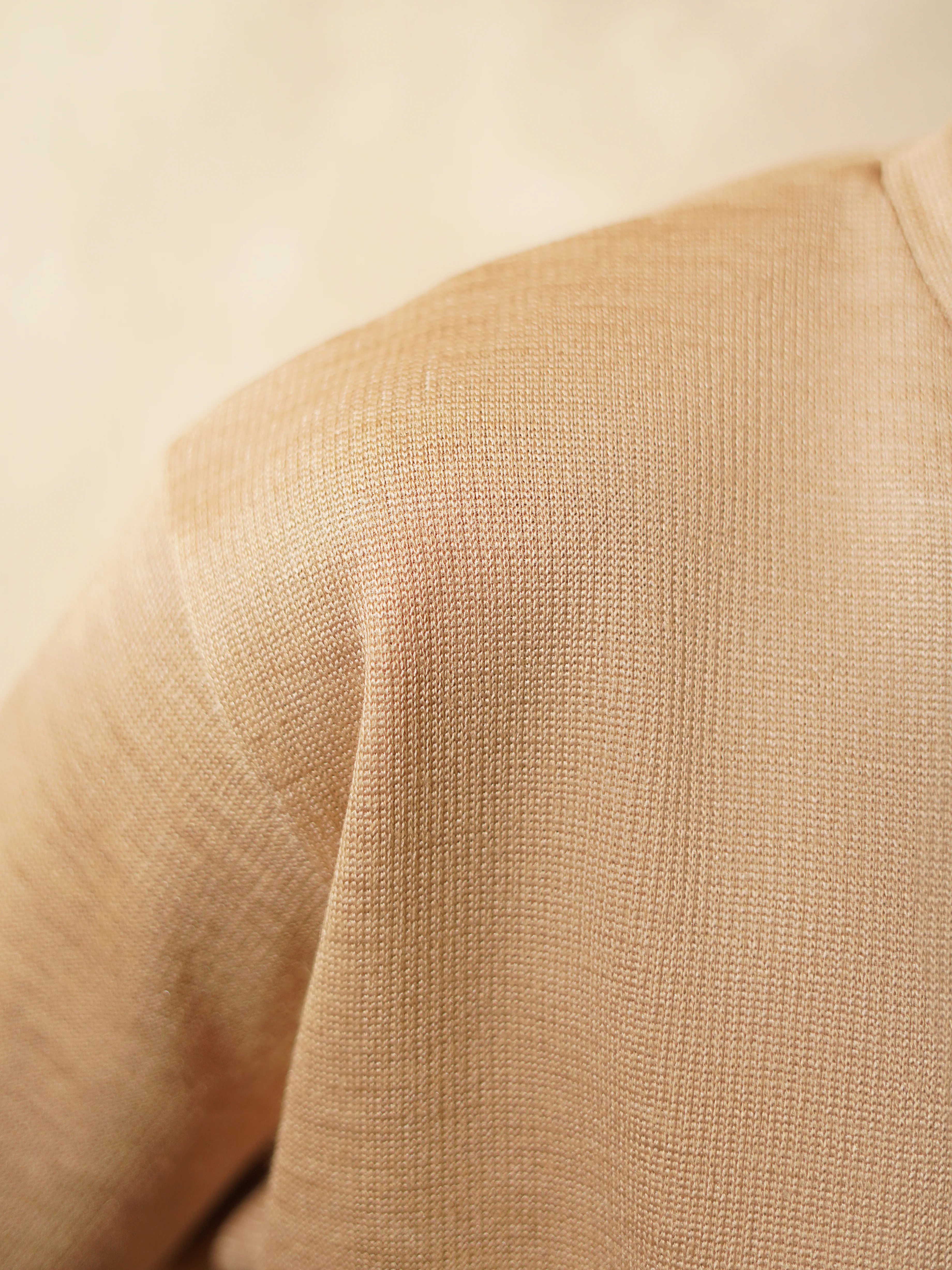 The mock neck design adds an element of modernity while remaining grounded in classic aesthetics, offering a polished look without excess. The slim yet comfortable fit ensures versatility, sustainably bridging casual and formal attire. Its minimalistic design speaks to those who value hand-craftsmanship and enduring quality over fleeting trends.