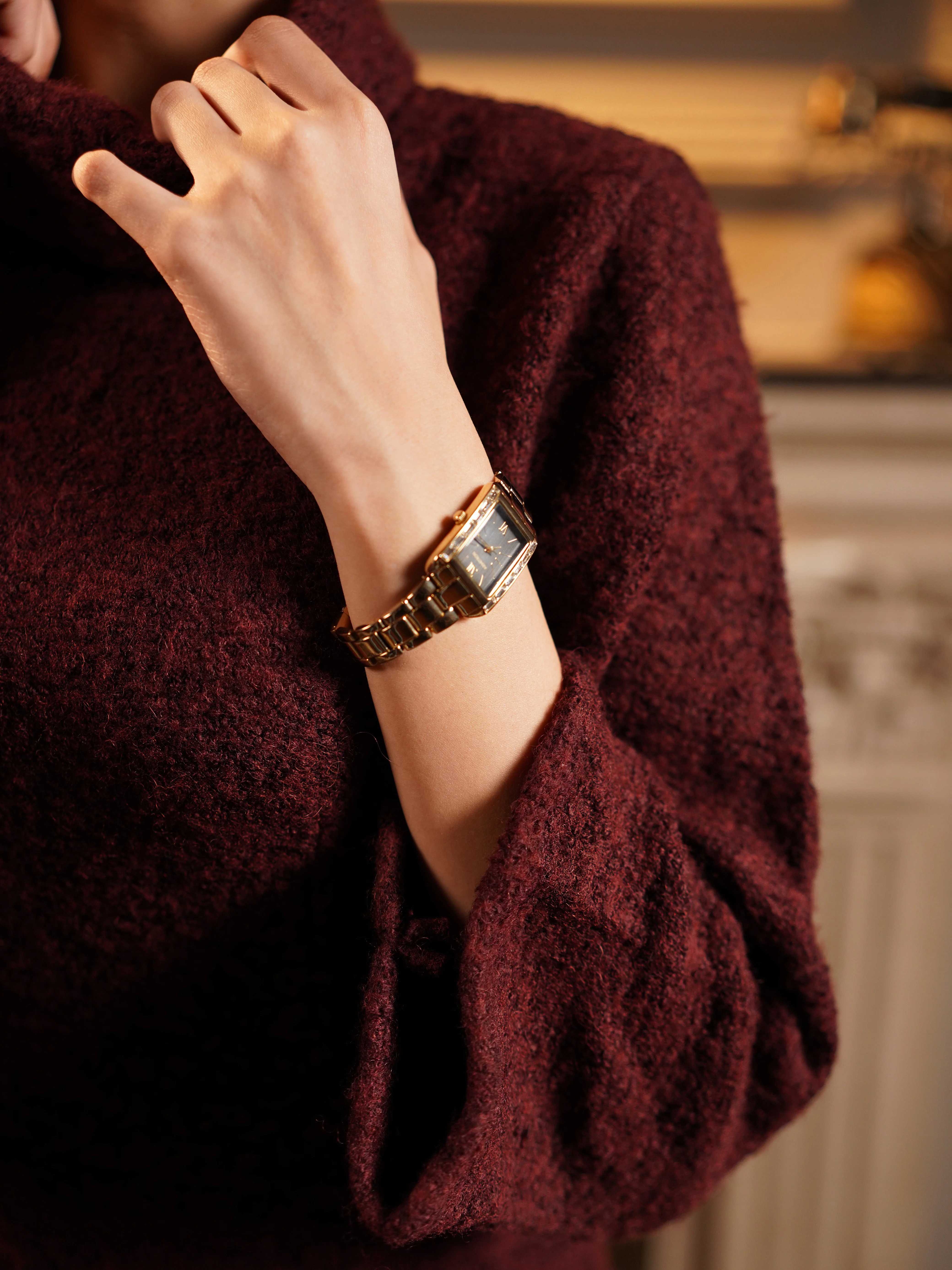 Made from premium wool material. Deep maroon, offering a warm and luxurious tone. Tailored bodycon fit that enhances the natural shape without compromising comfort. High neckline with a slight structured roll, giving the dress a regal and elegant appearance. Three-quarter length sleeves with a slightly flared cut, balancing femininity with practicality. Modest side slit for ease of movement and an added stylish touch. Features a concealed back zipper for a seamless and polished finish.